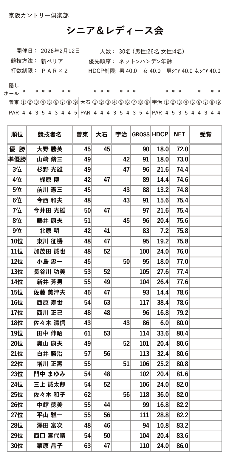 2026年2月に開催されました、シニア&レディース会の競技結果を掲載しました。