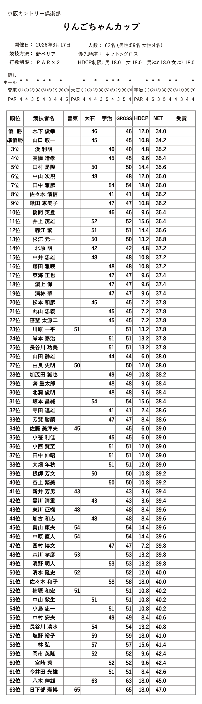 2026年3月に開催されました、ゴルフ大好きりんごちゃんカップの競技結果を掲載しました。