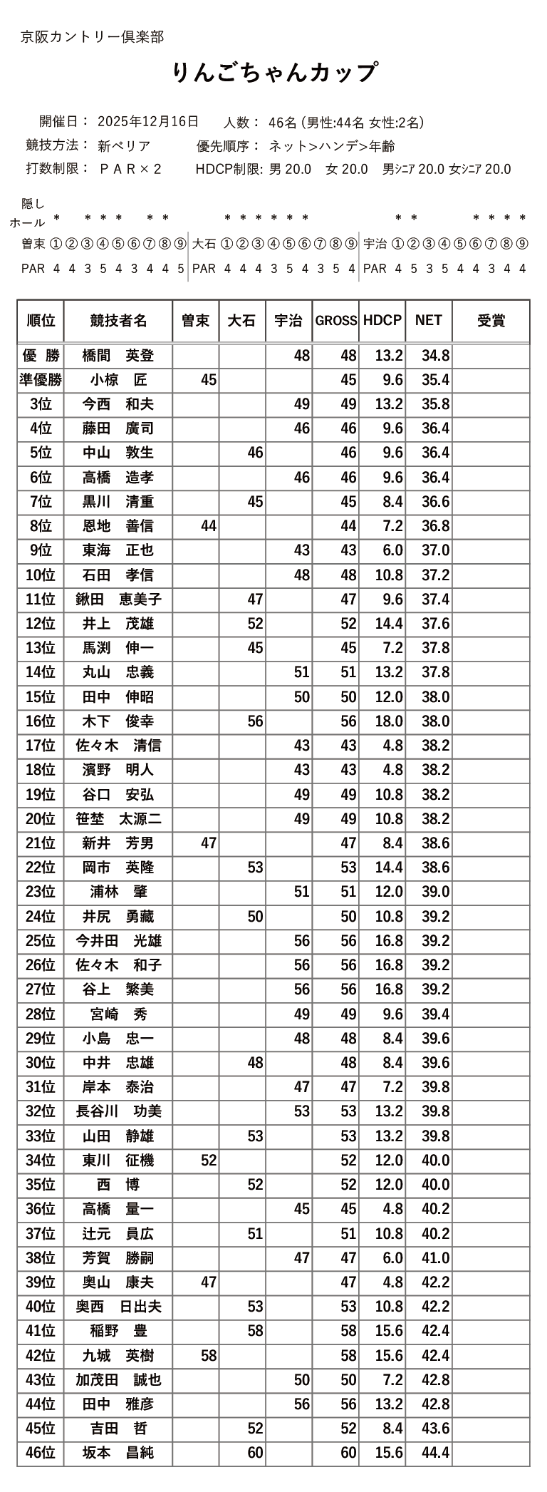 | 12/13(火) | ゴルフ大好きりんごちゃんカップ | PDF | JPG1 , JPG2 |